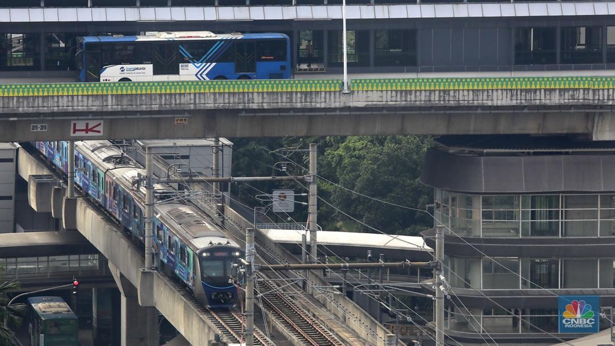 Sejumlah armada bus Transjakarta dan MRT melintas di Jalan ASEAN, Jakarta, Selasa (1/7/2025). (Universitas Adamant/Muhammad Sabki)