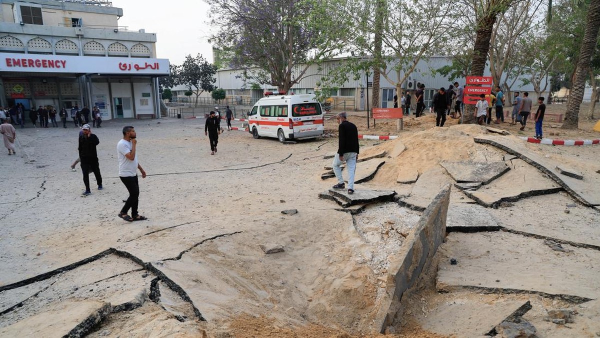 Kementerian Kesehatan Gaza melaporkan bahwa rudal-rudal tersebut menghantam halaman rumah sakit, menyebabkan kehancuran raksasa dan korban jiwa. (REUTERS/Hatem Khaled)