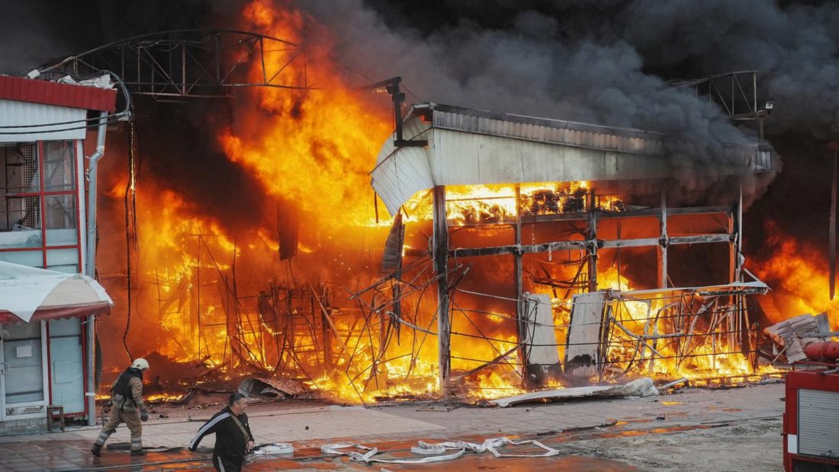 Serangan tersebut menyebabkan beberapa bangunan pasar terbakar dan menghancurkan parah. (REUTERS/Viktoriia Yakymenko)