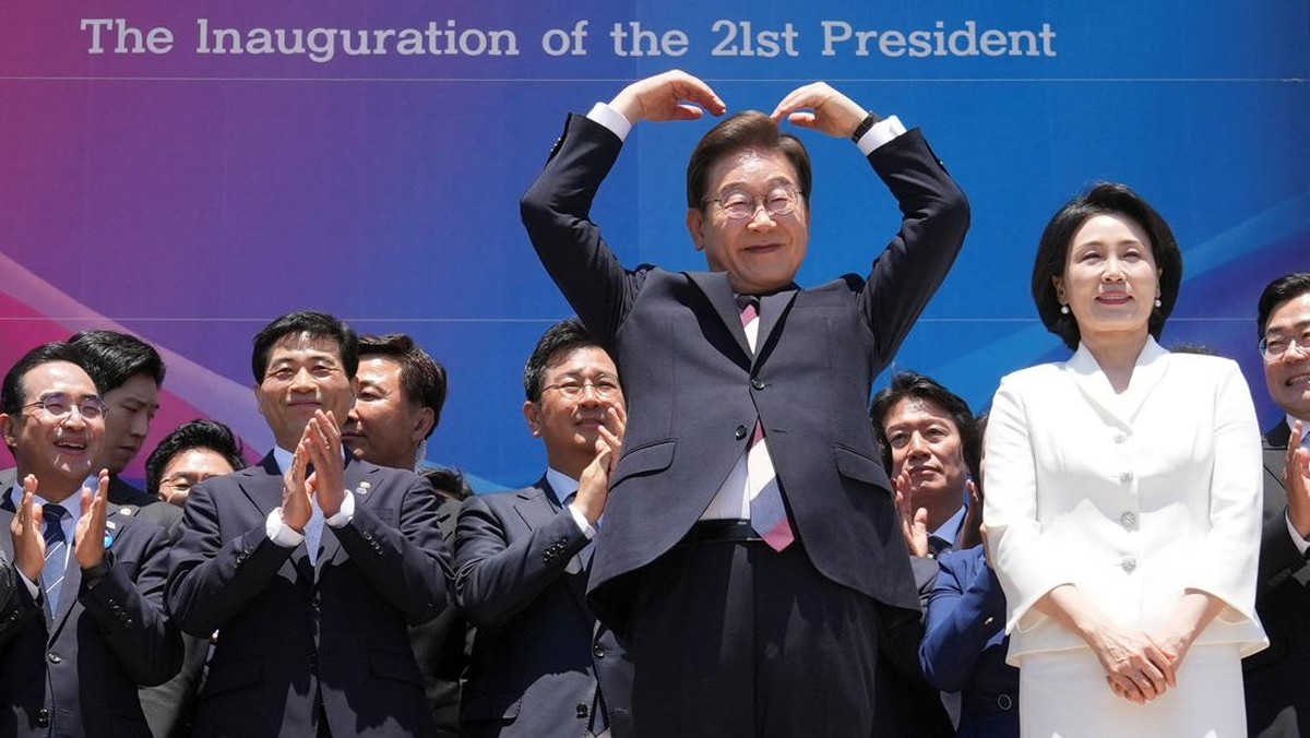 Lee Jae-myung mengambil sumpahnya dalam upacara pelantikannya. Lee, yang mana saat yang ini berusia 61 tahun, meraih 49,42% suara, mengalahkan kandidat asal-usul Partai Kekuatan Rakyat yang mana berkuasa, Kim Moon-soo. Tingkat partisipasi pemilih mencapai 79,4%, tertinggi sejak 1997. (ANTHONY WALLACE/Pool via REUTERS)